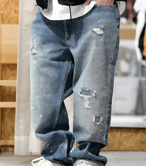 HT32805 - 復古藍調潑漆破洞寬鬆牛仔褲