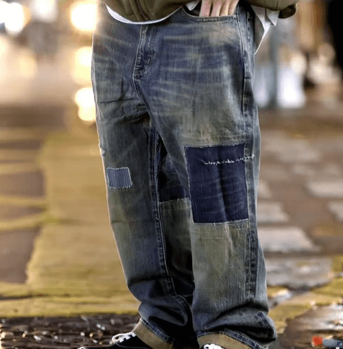 HT69412 - 經典藍調多色補丁工裝牛仔褲